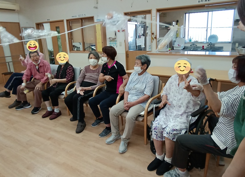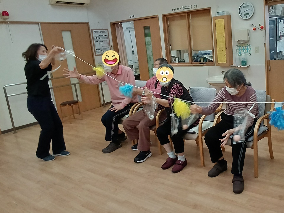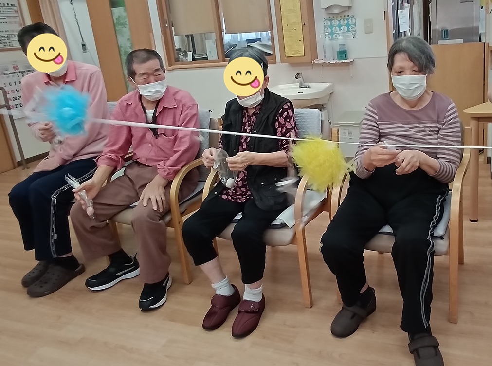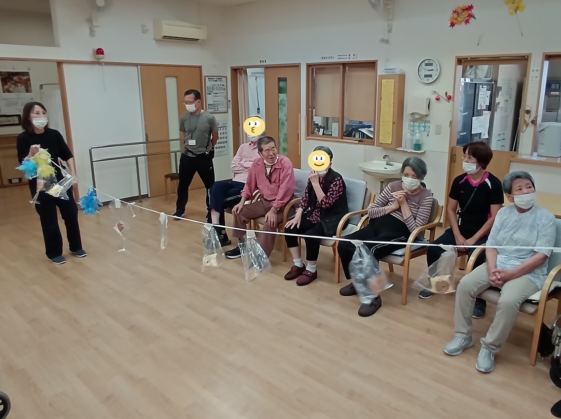 投稿日: 2025年10月24日2025年10月25日 投稿者: matsubara10月24日(金) 「秋の運動会」 半袖で十分だった先週から一転、急激に気温が下がった今週。皆さま、風邪などひかれてませんでしょうか? 秋の運動会 第二弾を開催しました。今日の種目は食欲の秋ということで「おまんじゅう食い競争」です。美味しそうなおまんじゅうを狙っています。 おまんじゅうをぶら下げている紐がぐるぐる回って、なかなか手が届かず悪戦苦闘です。やっとのことで手にしたおまんじゅう!「狙ってたやつが取れたわ!」と大喜び!周りの方も大笑いです。楽しい時間を過ごされたようです。