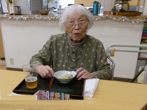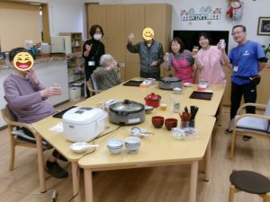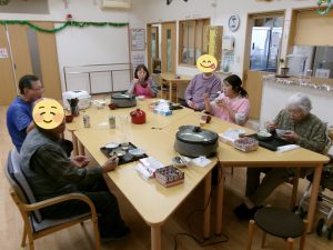 投稿日: 2025年12月26日 投稿者: matsubara12月24日(水)「忘年会」 「忘年会」 今年も残すところあとわずかになりましたね。美味しそうなお野菜と柿を頂いたので、昼食はお鍋で忘年会をすることにしました。 お鍋は、関西風のおだしの寄せ鍋とごま豆乳鍋の2種類。 ノンアルコールで乾杯!「わぁ~お鍋なんか久しぶりやわ!」「みんなで囲むお鍋は美味しいね!」といつもよりお箸がすすみ、スタッフがおなか一杯になった後も、何度もお代わりをして召し上がってくださいました。 会話もはずみ、楽しい忘年会になりました。