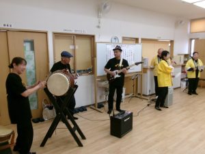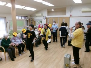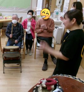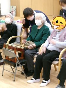 投稿日: 2026年1月26日2026年2月9日 投稿者: matsubara1月24日(土) 「河内音頭と太鼓でドンドコドン!」 お囃子演芸我孫子苅田河内音頭同好会の皆さまが1年振りに来てくださいました。 ご利用者の皆さまもスタッフも河内音頭を歌って踊って大賑わい! 太鼓も叩いてドンドコドン!皆さま笑顔が弾け、楽しい時間となりました。